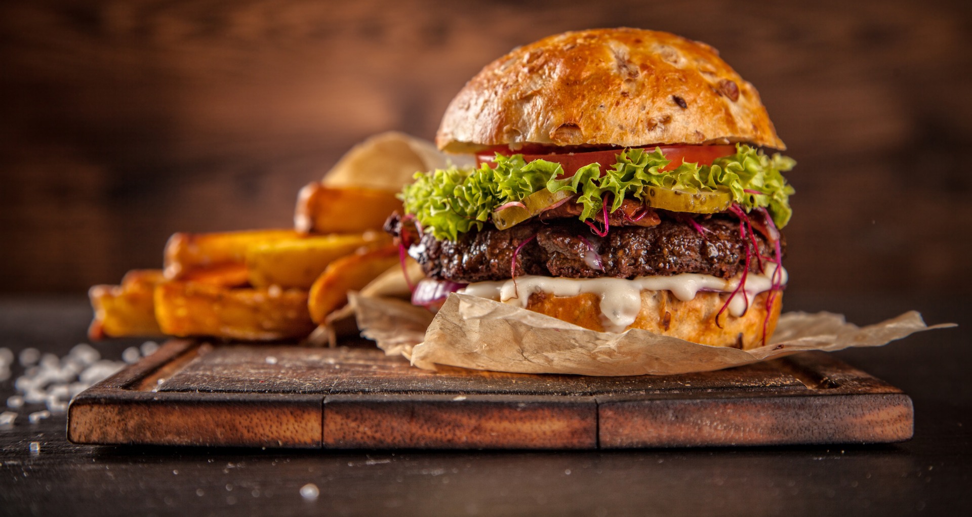 marha hús, buci, római saláta, csemege uborka, ropogós hagyma, burger szósz